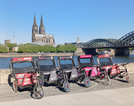 Mit dem Fokus auf Nachhaltigkeit, Kultur und Qualität bieten wir alles, was mit der außergewöhnlichen und umweltbewussten Fortbewegung per Fahrradtaxi durch Köln zu tun hat. Ob Stadtrundfahrt, Hochzeitsgesellschaft, Business-Shuttle-Service, der gesamten Organisation großer Gruppentouren oder Promotion-Events mit individuellem Branding - nichts ist undenkbar! Mit saisonalen Angeboten, wie Picknick- und Glühweinfahrten freuen wir uns darüber unseren Fahrgästen zu jeder Jahreszeit unvergessliche Rikscha-Momente zu bereiten. Von den FahrerInnen, dem Inhaber, der Werbedesignerin, dem Techniker und dem Backoffice— wir alle verstehen uns als Team, in dem das Wohl und die Wünsche unserer Kunden das oberste Gut ist. Überzeugen Sie sich selbst und lassen Sie es rollen!